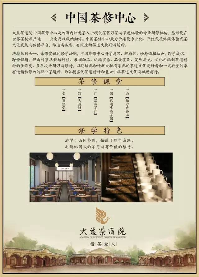 大益集团继开创大益茶道院后,于今年设立中国茶修中心。中国茶修中心将通过大益专业而领先的普洱茶制茶技艺和深厚的企业文化的传承与领受,在勐海这块茶树圣地以游学的方式体验风物,以天地为师,以自然为友,感受茶道真谛、悟得生命况味。大益茶道院勐海分院执行委员会主任委员万平为大家介绍了该中心成立的因缘契机、成立宗旨、班级设置、修学特色及2016年中国茶修中心的总体规划。中国茶修中心近期即将开展第一期招生项目,期待大家的关注!