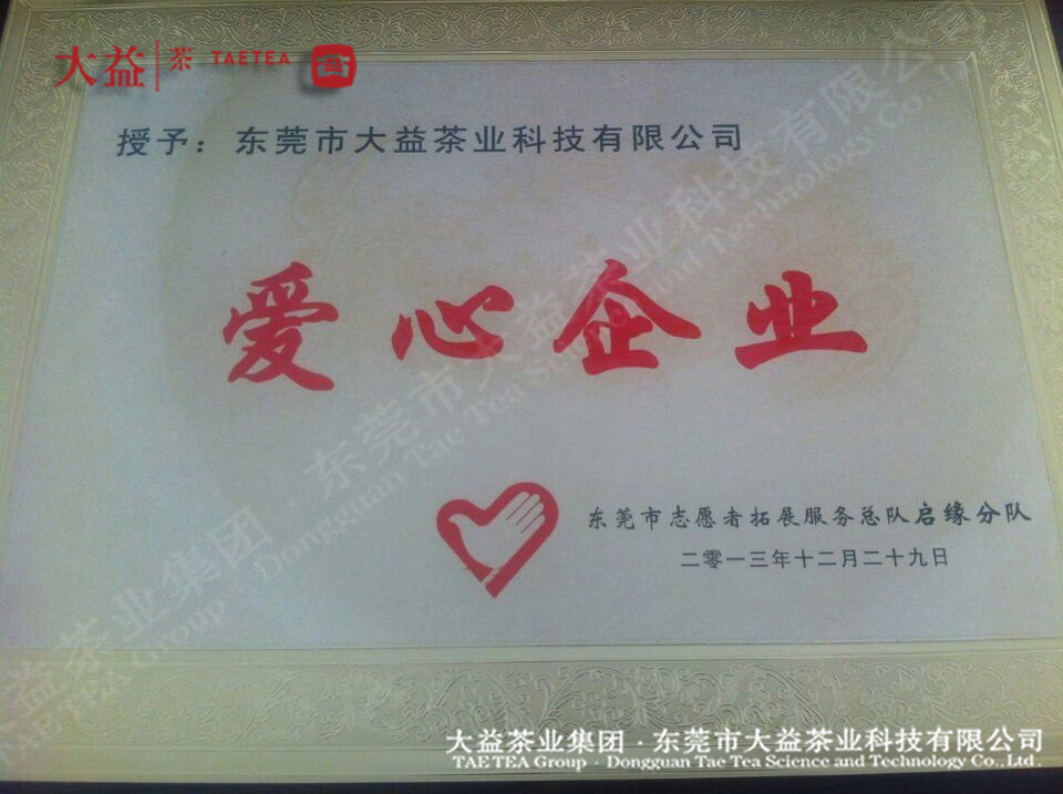 大益集团非常注重于社会公益事业方面的投入,仅在最近几年就累计投入数千万元。东莞市大益茶业科技有限公司自成立以来,积极履行企业社会责任,始终坚持“成就于社会,奉献于社会”的宗旨,积极致力于回报社会,参与社会各类公益事业,以公平、开放、学习、自尊、自信的企业文化,关爱员工成长、工作和生活。关注社会公益事业,做有爱心的茶企,是公司和大益人内心的深切期许。
