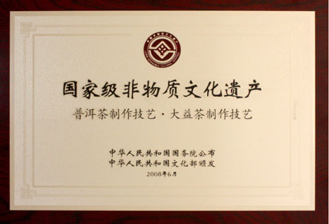 国家文化部颁发,国家级非物质文化遗产 大益茶制作技艺